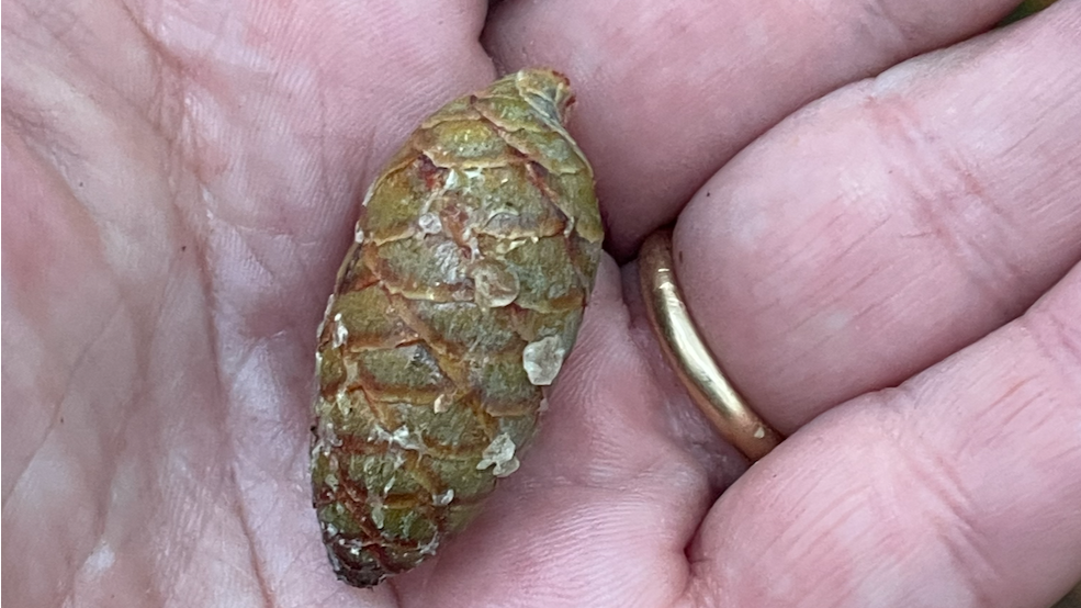 I was walking my dog on a trail yesterday when we came across a tall conifer in a spruce-fir-hemlock stand that seemed to be dropping green cones.